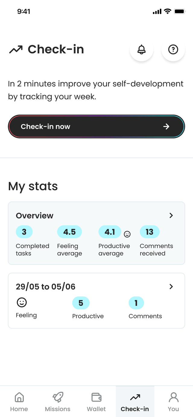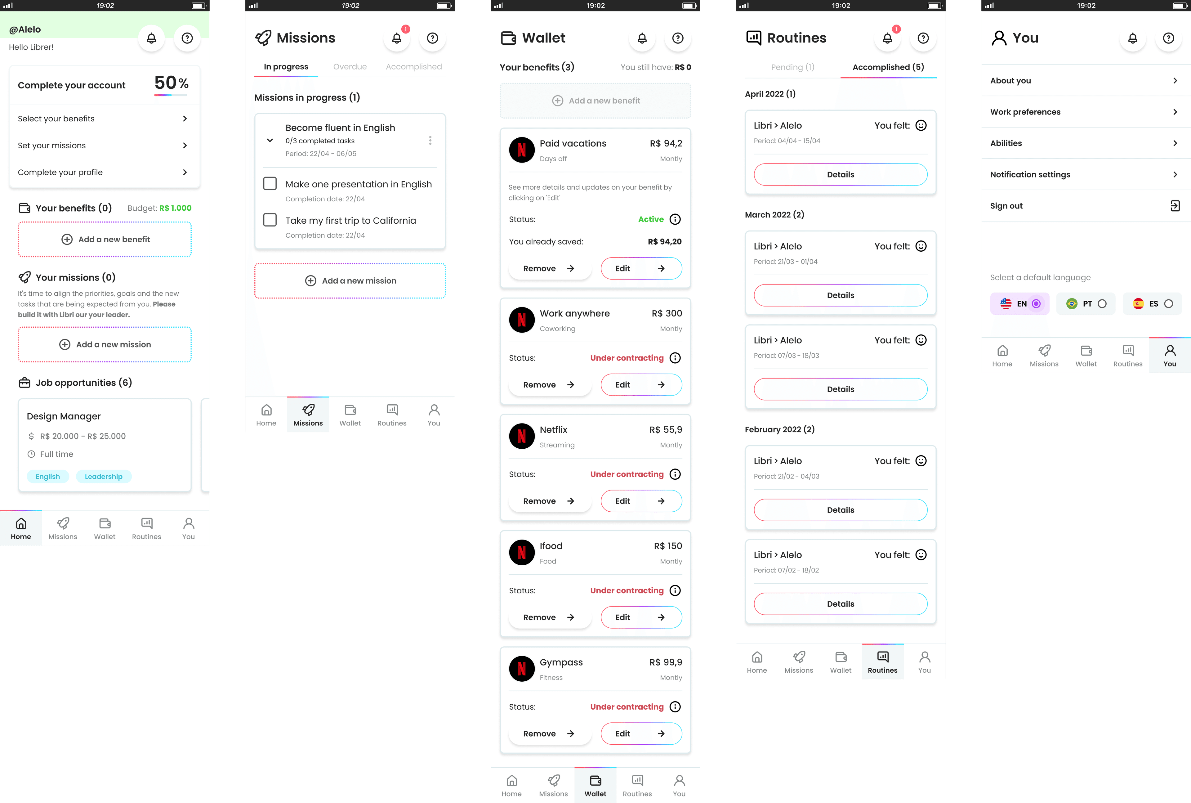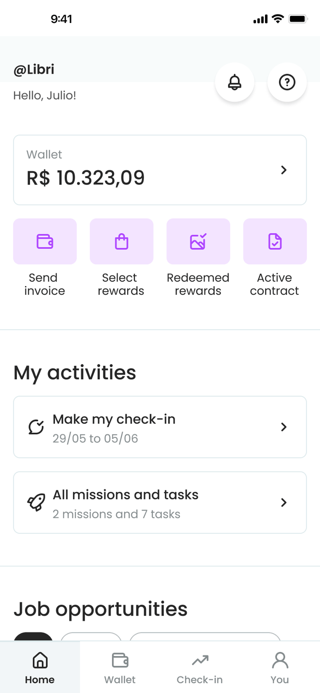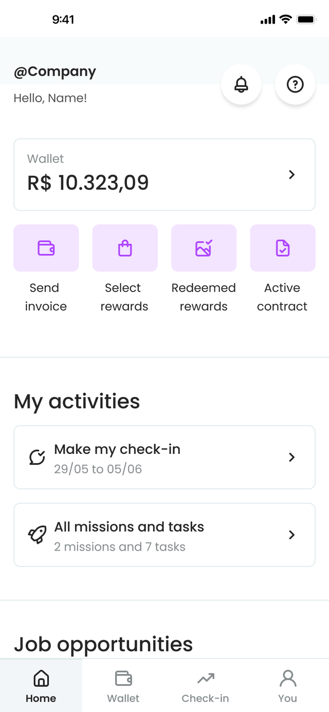 Based on our learnings, we created an MVP with five core functionalities for the outsourced workers: rewards, invoices, missions, journey metrics, and profile.